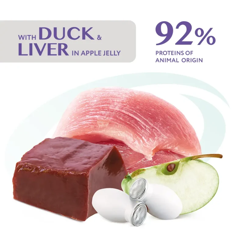 Ingrediente: 84 % bucăți de carne și produse de origine animală (inclusiv 28 % rață, 14 % pui, 12 % inimă de vită și altele), 16 % ficat (bucăți întregi), fructe (3 % măr), derivați de origine vegetale (celuloză, răchiţele 0,05 %, vîzdoage (sursă de luteina) 0,01 %, rădăcina de brustur, rădăcina de althaea, flori de muşeţel 0,01 %, urzică 0,01 %, cimbru 0,01 %), extracte de proteine vegetale, minerale, zahăr, ulei şi grăsimi (ulei de somon, ulei de limba mielului), Actigen® (sursă de prebiotice – manano-oligo-zaharide) 0,01 %, beta 1,3/1,6 glucani 0,01 %.