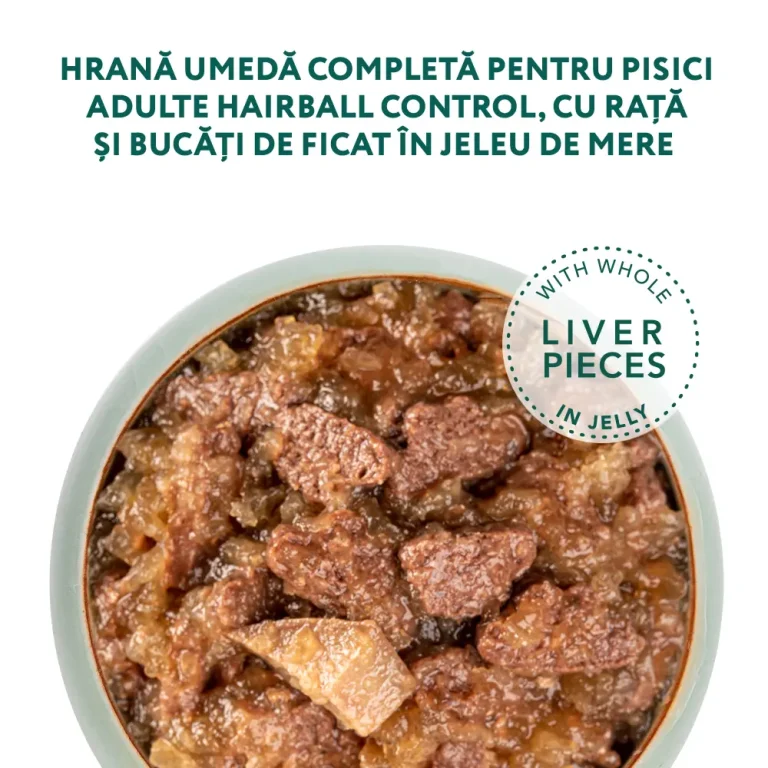 -Carnea de rata si bucati de ficat intregi ofera pisicii proteine de origine animala de inalta calitate, ajuta la mentinerea muschilor intr-o forma excelenta