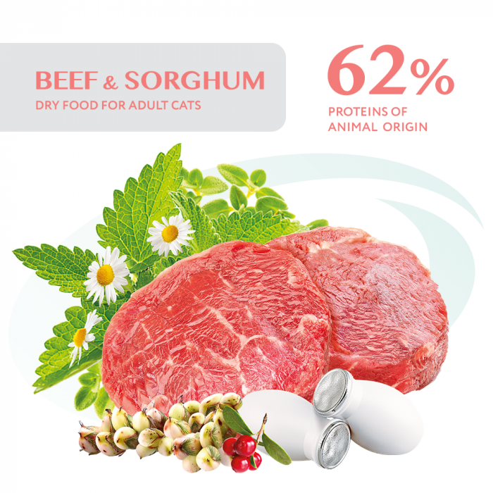 Compozitie: carne de vita dezosata 14%, proteine ​​de curcan deshidratate, cel putin 12%, proteine ​​de pui deshidratate, cel putin 12%, orez, proteine ​​din porumb, sorg cu cereale integrale 8%, porumb, grasime de pui, proteine ​​ hidrolizate de origine  3,5%, celuloza, pulpa de sfecla, minerale, seminte de in 1,9%, drojdie de bere, praf de ou, ficat de pui uscat hidrolizat, ulei de somon, afine 0,2%, ulei de peste boraga, beta-1,3 / 1,6 glucani 0,05%, Actigen® (sursa de prebiotice-manano-oligozaharide) 0,04% , galbenele (sursa de luteina) 0,04%, radacina de brusture, radacina de alteia, flori de musetel 0,03%, urzica 0,03%, cimbru 0,015%.