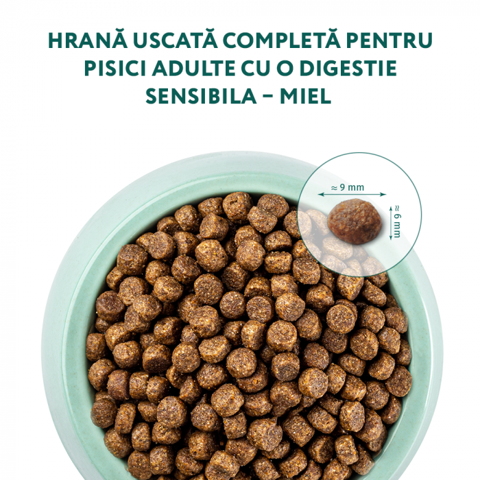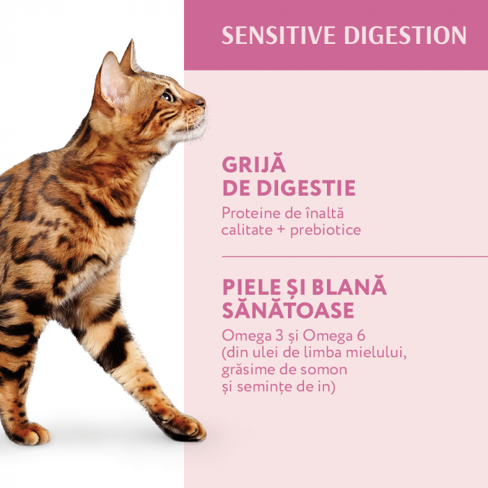 - Datorita proteinelor de inalta calitate, usor digerabile, care contine carne proaspata de miel- protejează sistemul digestiv sensibil al pisicii