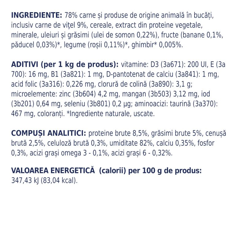 COMPOZITIE: 78 % carne și produse de origine animală în bucăți, inclusiv carne de viţel 9 %, cereale, extract din proteine vegetale, minerale, uleiuri și grăsimi (ulei de somon 0,22 %), fructe (banane 0,1 %, păducel 0,03 %)*, legume (roșii 0,11 %)*, ghimbir* 0,005 %.
