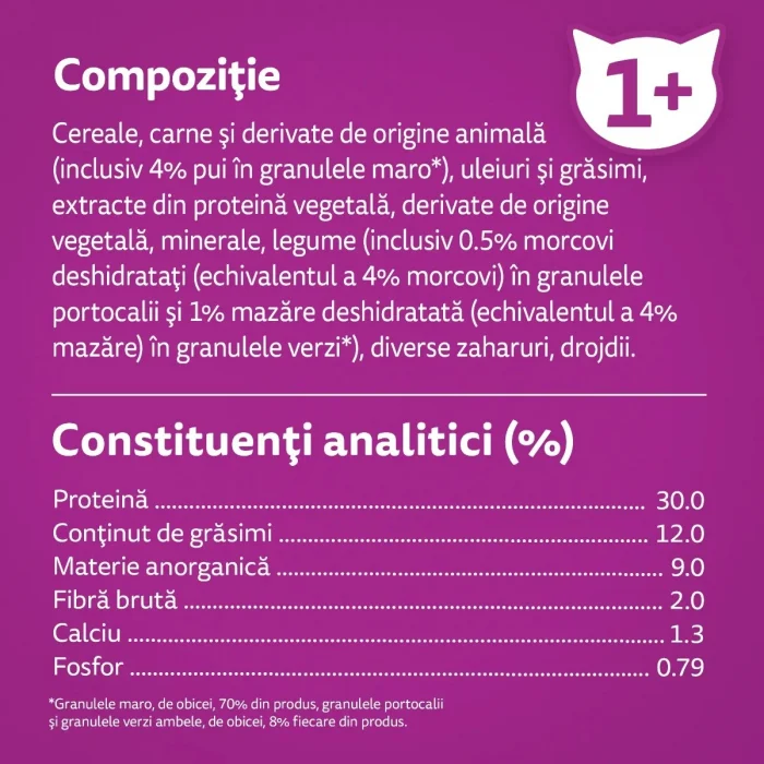 Whiskas Hrana Uscata Pisica Adult cu Pui si Ficat 300g1. Aceasta reteta delicioasa este special formulata pentru a asigura 100% din nevoile zilnice ale pisicii tale 1+ si o sursa naturala de fibre. Create fara adaos de coloranti sau arome artificiale. 2. Contine o combinatie echlibrata de minerale pentru sustinerea tractului urinar inferior. 3. Cu Vitamina A, esentiala pentru o vedere puternica si clara 4. Cu Zinc, esential pentru sanatatea pielii si a blanii. 5. Ne angajam sa reducem impactul nostru asupra mediului. Fabricile noastre folosesc 100% energie regenerabila.Compozitie:cereale, carne si derivate de origine animala (inclusiv 4% pui in granulele maro*), uleiuri si grasimi, extracte din proteina vegetala, derivate de origine vegetala, minerale, legume (inclusiv 0.5% morcovi deshidratati (echivalentul a 4% morcovi) in granulele portocalii si 1% mazare deshidratata (echivalentul a 4% mazare) in granulele verzi*), diverse zaharuri, drojdii. *Granulele maro, de obicei, 70% din produs, granulele portocalii si granulele verzi ambele, de obicei, 8% fiecare din produs.Aditivi per kg:Antioxidanti, Coloranti;Aditivi nutritionali:Vitamina A:4465UI, Vitamina D₃:492UI, Vitamina E:74.5mg, Taurina:1140mg, Cupru (Sulfat de cupru (II) pentahidrat):5.9mg, Iod (Iodura de potasiu):1.5mg, Mangan (Sulfat de mangan, monohidrat):10.1mg, Seleniu (Selenit de sodiu):0.10mg, Zinc (Sulfat de zinc, monohidrat):28.6mg.Constituenti analitici (%):proteina:30.0;continut de grasimi:12.0;materie anorganica:9.0;fibra bruta:2.0;calciu:1.3;fosfor:0.79.